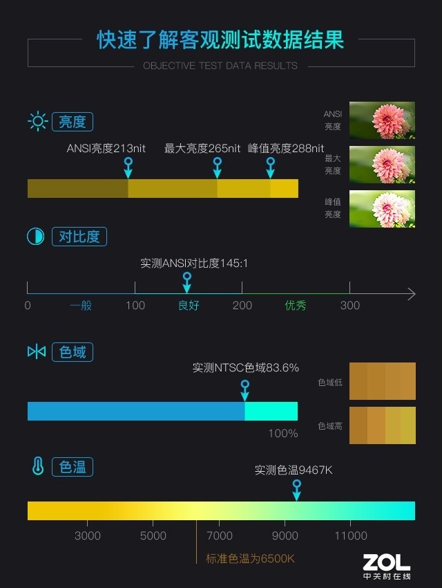 接下来是光峰A300 4K臻彩激光电视的客观数据实测,这个环节的测试我们主要采用美国国家标准协会制订的ANSI标准,这一标准也是业内公认的权威标准。并考察以下几个方面:最大亮度、峰值亮度、优化亮度以及投影机的对比度色彩等方面。