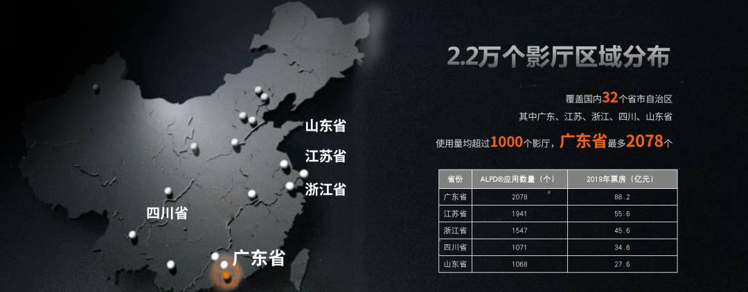 所谓“高亮版”影片,即在ALPD放映标准下进行调色增亮,并专门针对满足亮度标准的ALPD激光放映设备提供,从而实现更好的放映效果。其最终的亮度是普通影片的180%,可呈现更多的色彩层次,更清晰的画面细节。该版本也是当前市场上第一个让激光放映机真正放映激光电影的版本,可以说是为激光放映设备量身定制。目前,已经采用光峰科技ALPD激光放映技术的22000个影厅覆盖全国众多省份,其中广东、江苏、浙江、四川、山东的影厅数量位列前五,安装量均在1000以上。其中广东已超过2000个。据行业统计显示,2019年以上五个省份为票房Top5。