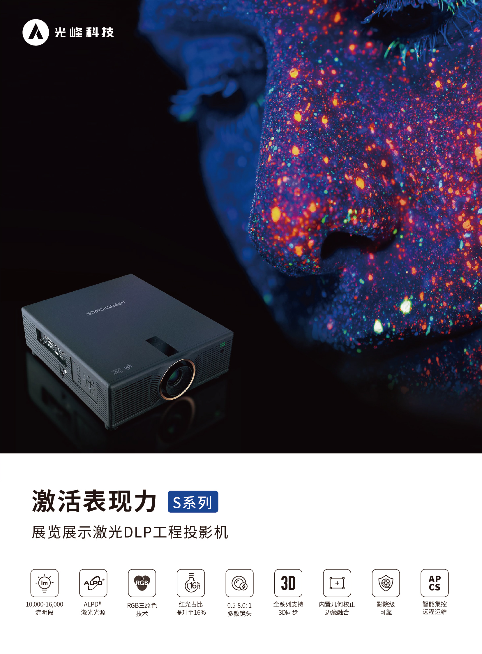 激活色彩S系列工程投影机,RGB三原色技术,色彩亮度100%。